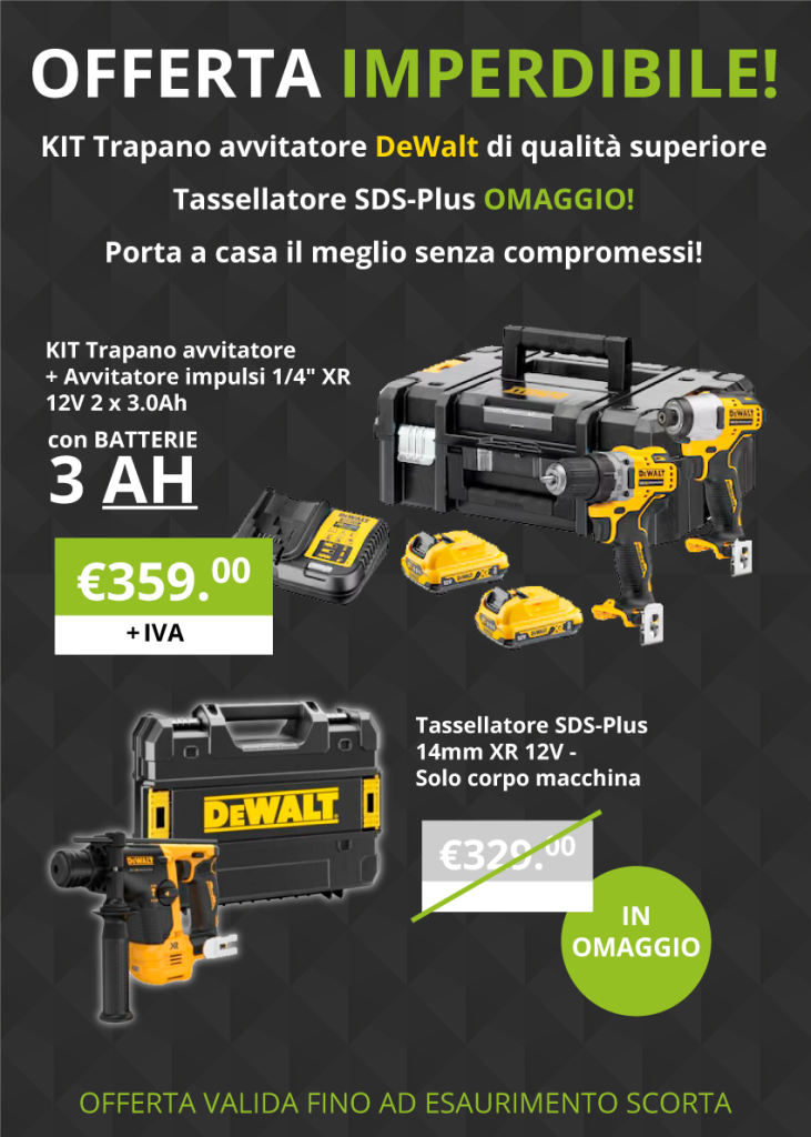“La qualità professionale DeWalt ti aspetta! Non lasciarti sfuggire questa occasione: Acquista il KIT Trapano Avvitatore DeWalt e ricevi in OMAGGIO un Tassellatore SDS-Plus. Un’offerta imperdibile per chi vuole attrezzarsi con il meglio senza compromessi! ⏳ Valida fino ad esaurimento scorte. 💼 Perfetta per professionisti e amanti del fai-da-te! 👉 Approfitta subito e porta la potenza DeWalt nei tuoi progetti.